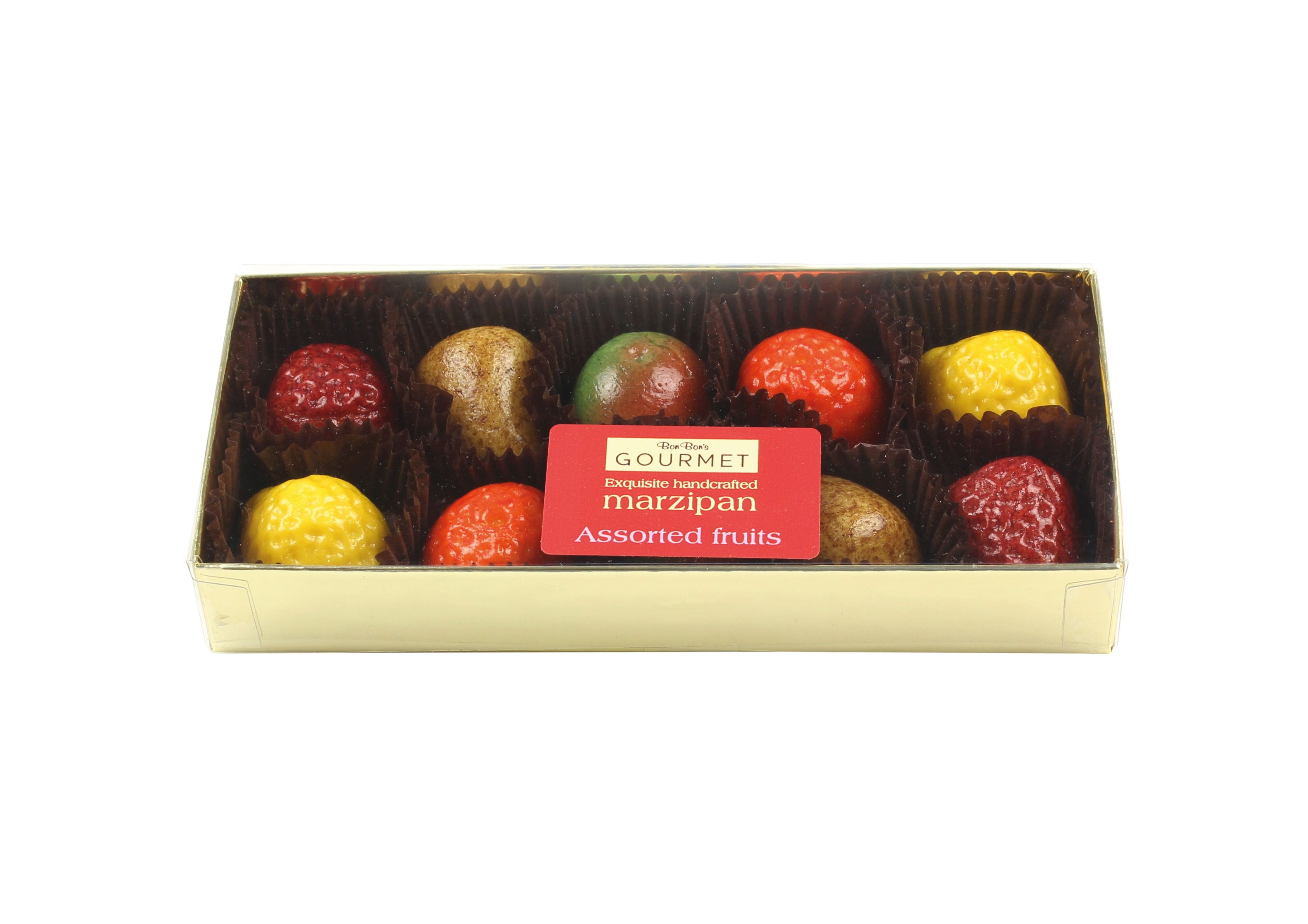 This selection of marzipan fruits presented in a clear gift box makes an ideal present or an indulgent treat for a marzipan lover.