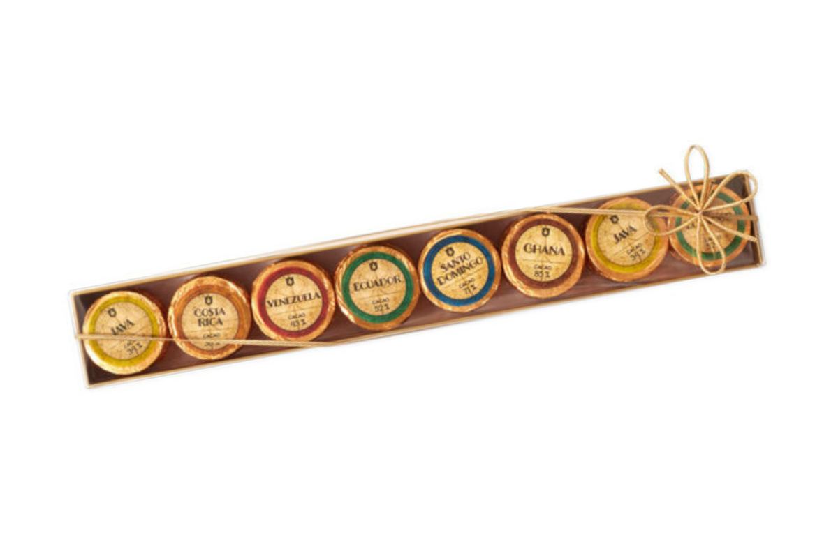 Take a trip through the chocolate capitals of the world with this delicious, gourmet selection of single-origin chocolate coins from DreiMeister. Each box contains 6 varieties ranging from 34% to 85% cocoa content: Java 34% Cocoa (milk); Costa Rica 38% Cocoa (milk); Venezuela 43% Cocoa (milk); Ecuador 52% Cocoa (dark); Santa Domingo 71% Cocoa (dark); Ghana 85% Cocoa (dark).