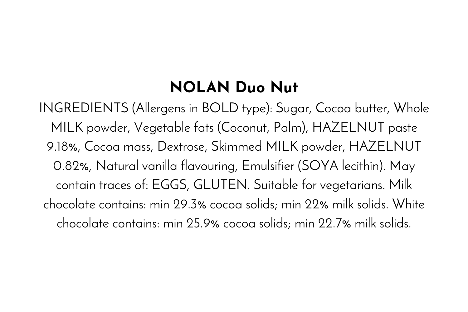 Sugar, Cocoa butter, Whole MILK powder, Vegetable fats (Coconut, Palm), HAZELNUT paste 9.18%, Cocoa mass, Dextrose, Skimmed MILK powder, HAZELNUT 0.82%, Natural vanilla flavouring, Emulsifier (SOYA lecithin). May contain traces of: EGGS, GLUTEN. Suitable for vegetarians. Milk chocolate contains: min 29.3% cocoa solids; min 22% milk solids. White chocolate contains: min 25.9% cocoa solids; min 22.7% milk solids.