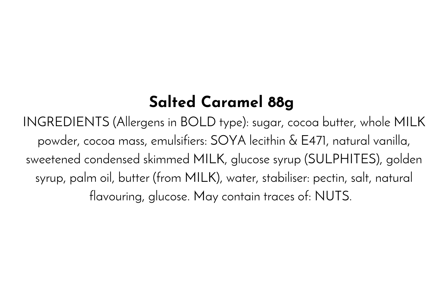 Milk chocolate 48% (Sugar, Cocoa butter, Whole MILK powder, Cocoa mass, Emulsifier: SOYA lecithin, Natural vanilla), Caramel 47% (Sweetened condensed skimmed MILK, Glucose syrup (SULPHITES), Golden syrup, Palm oil, BUTTER, Sugar, Water, Emulsifier: E471, Stabiliser: Pectin, Salt, Natural flavouring), Glucose syrup 2.9%, White chocolate 2% (Sugar, Cocoa butter, Whole MILK powder, Emulsifier SOYA lecithin, Natural vanilla), Salt. May contain traces of: NUTS. Milk chocolate contains: min 33.5% cocoa solids; min 21.7% milk solids.