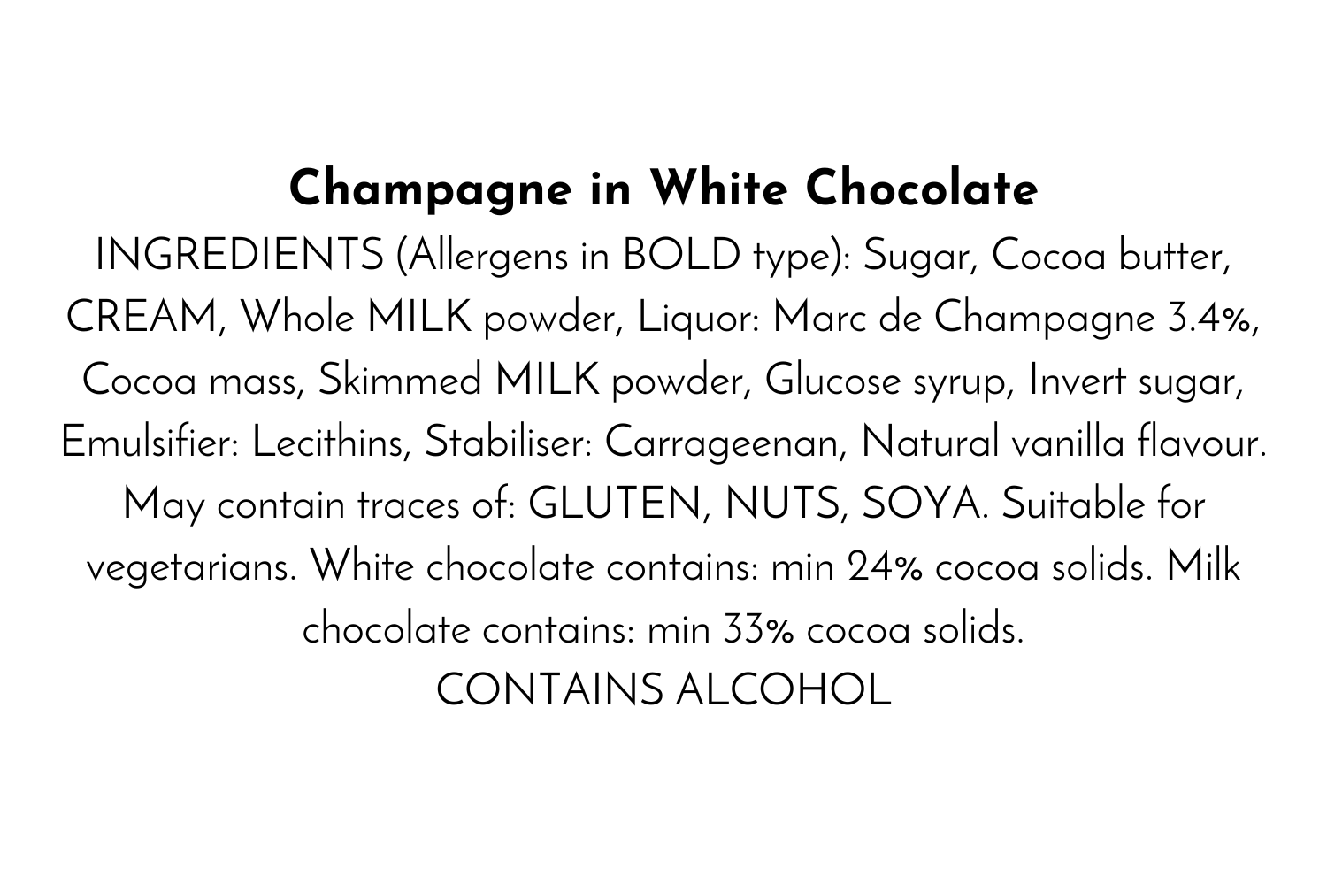 Sugar, Cocoa butter, CREAM, Whole MILK powder, Liquor: Marc de Champagne 3.4%, Cocoa mass, Skimmed MILK powder, Glucose syrup, Invert sugar, Emulsifier: Lecithins, Stabiliser: Carrageenan, Natural vanilla flavour. May contain traces of: GLUTEN, NUTS, SOYA. Suitable for vegetarians. White chocolate contains: min 24% cocoa solids. Milk chocolate contains: min 33% cocoa solids.