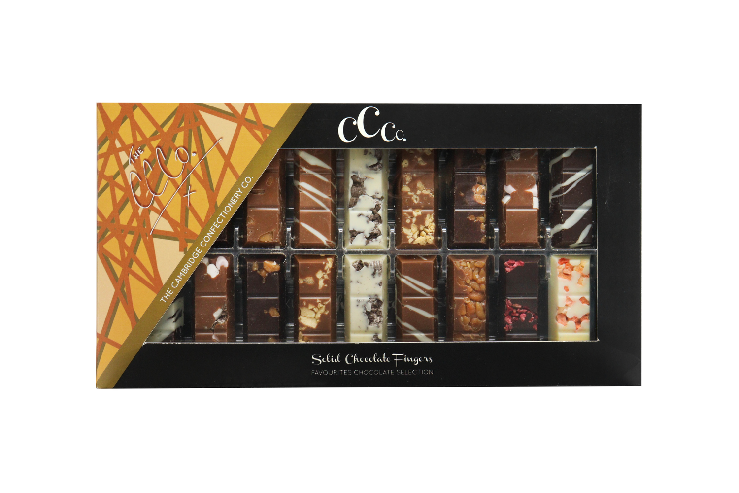 This gift box of 18 solid chocolate fingers contains nine of Cambridge Confectionery Co.'s best-selling flavours in Dark Chocolate, Milk Chocolate, or a Favourites selection.
