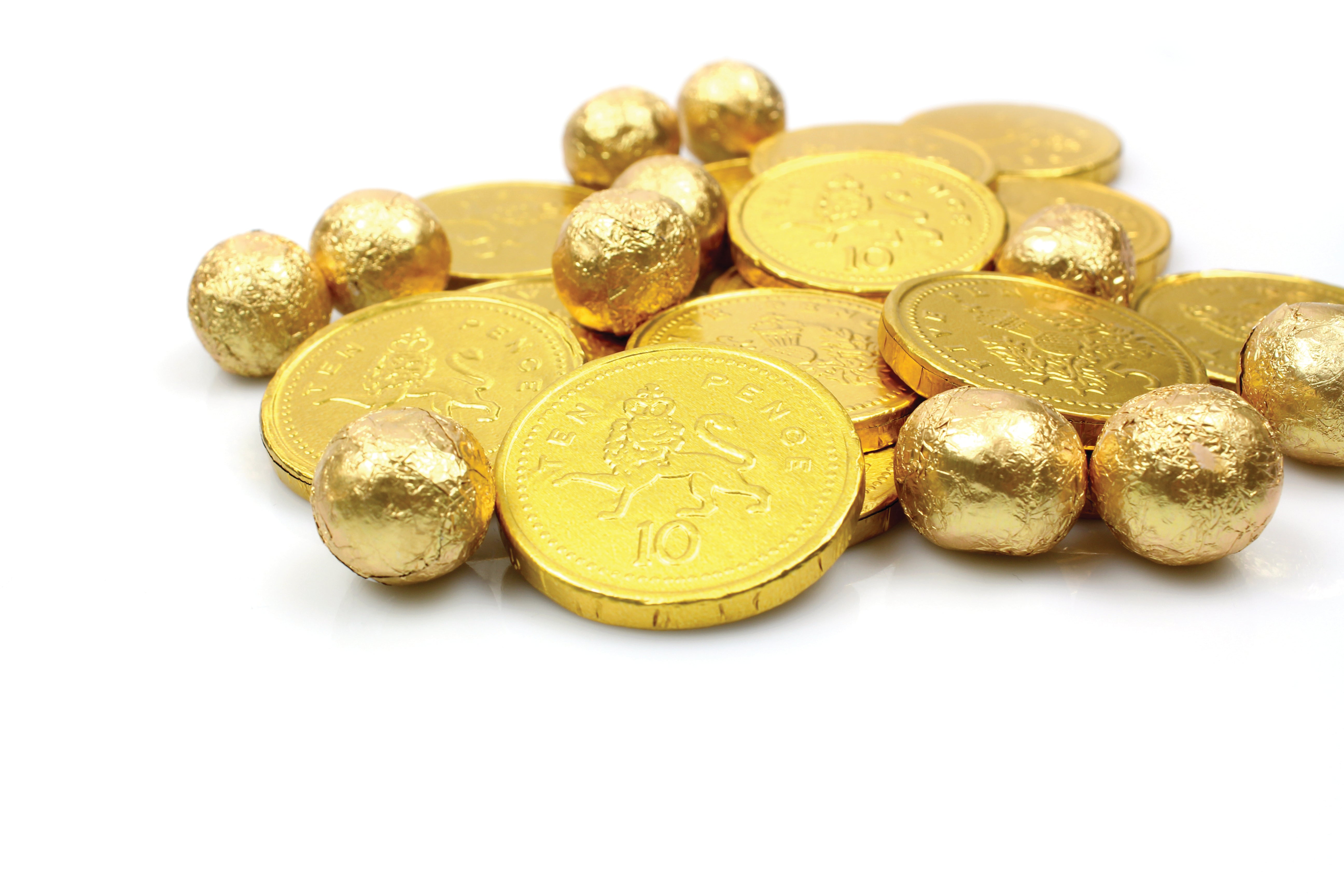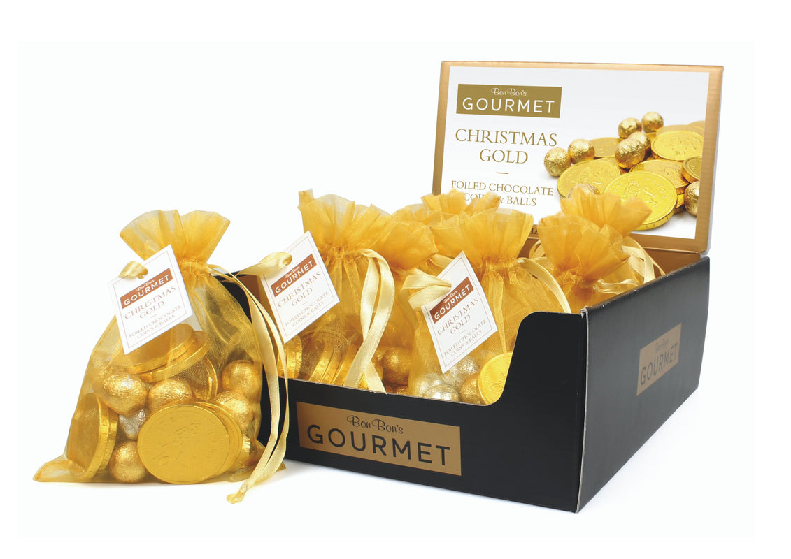 These stylish gold organza bags are filled with delicious chocolate coins and balls. Each individually wrapped in golden foil and finished with a golden ribbon to seal the bag.