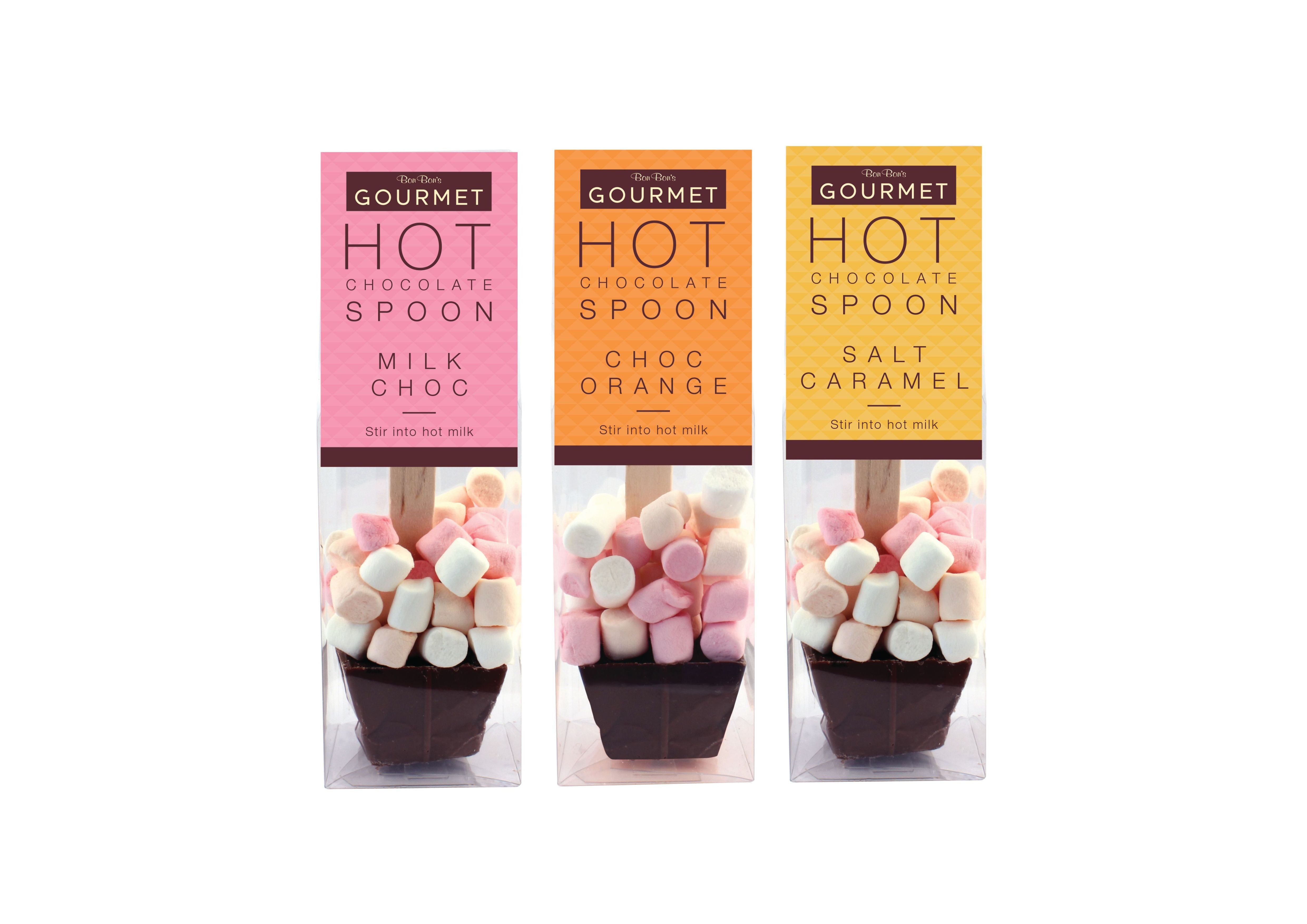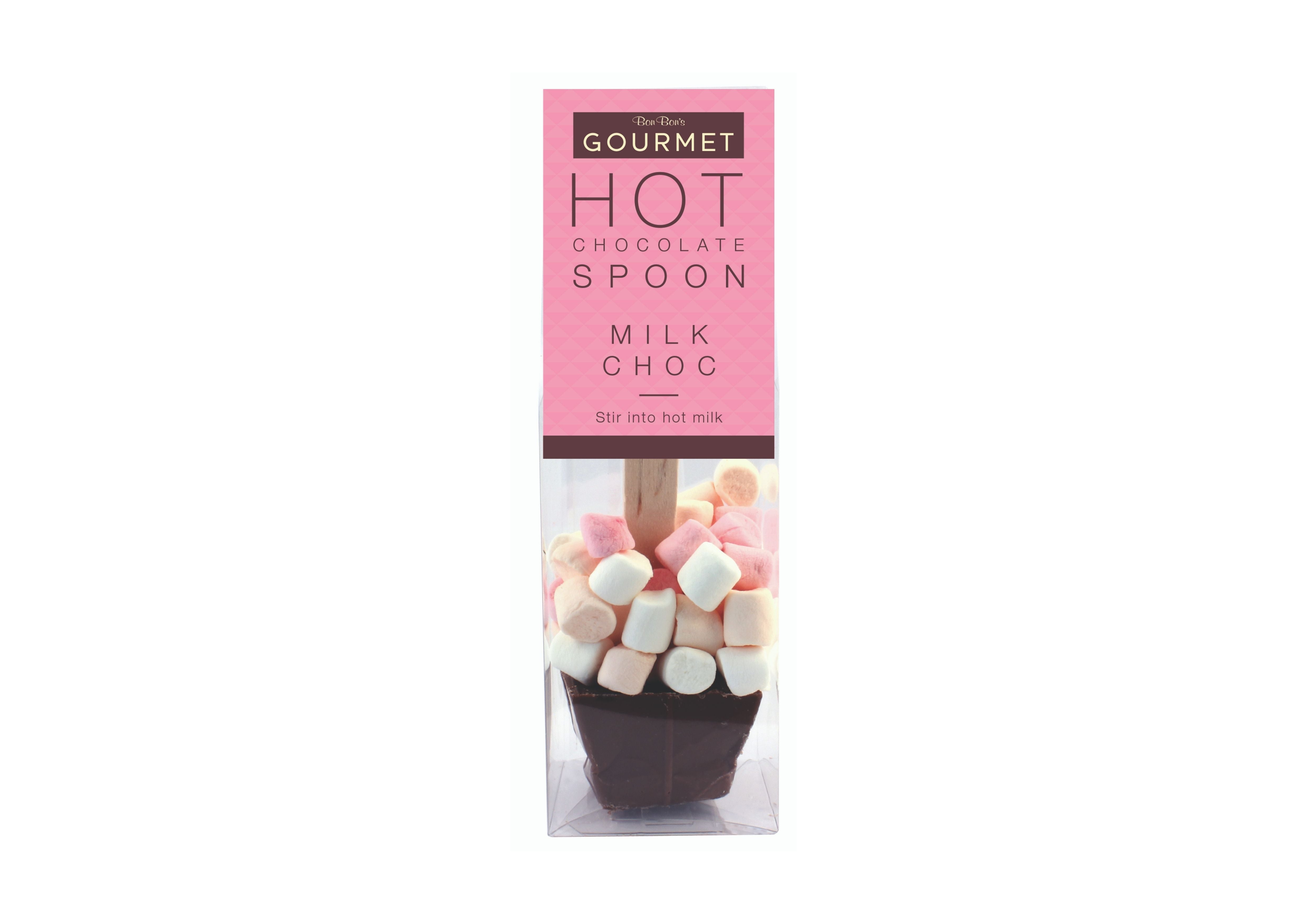 Enjoy a tasty cup by simply dropping the chocolate spoon into warm milk, stir in and watch the mallows float to the top...delicious!