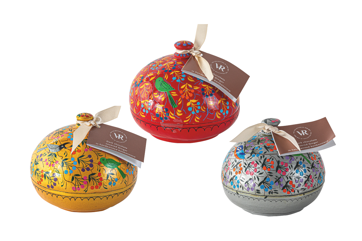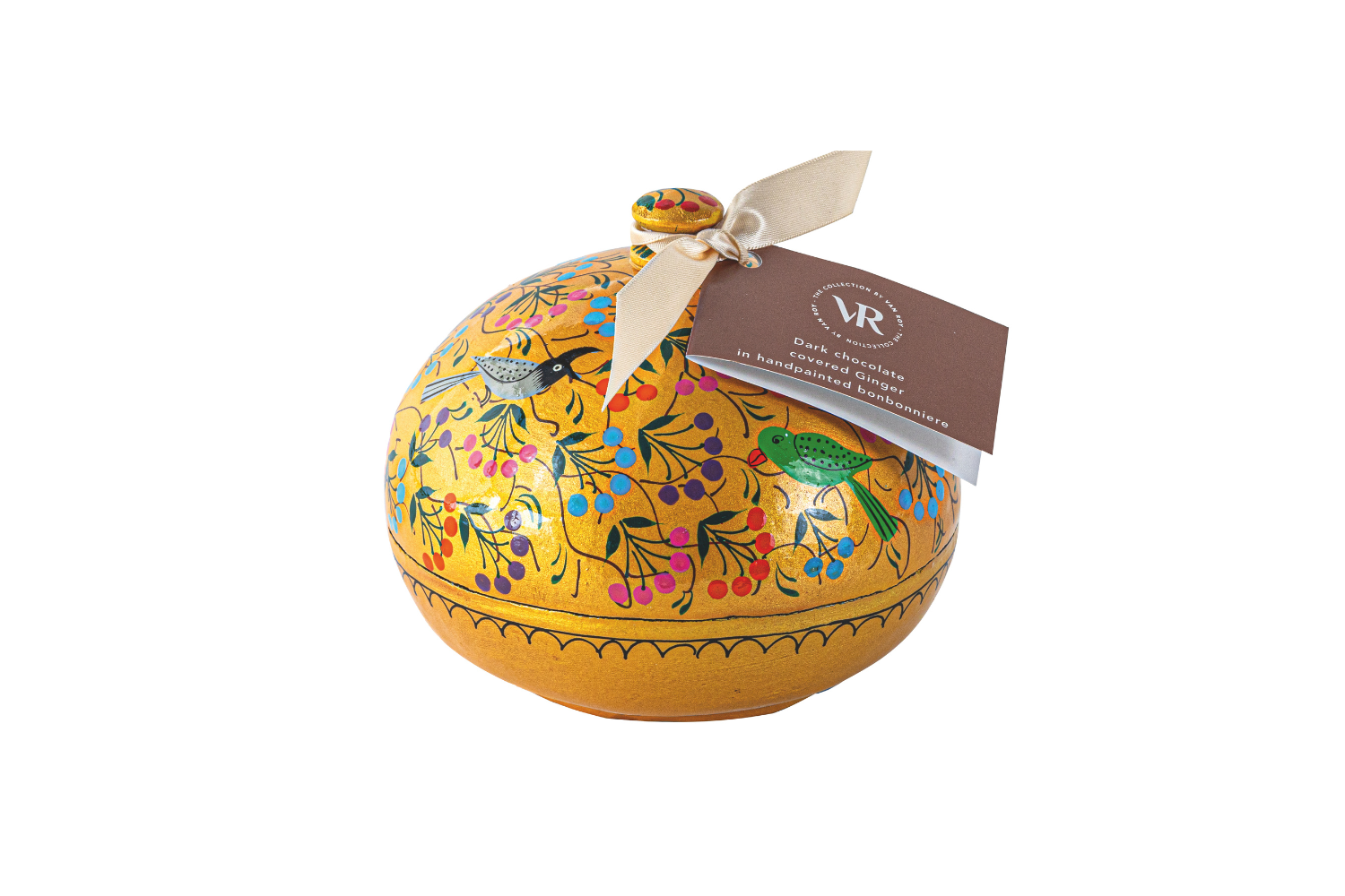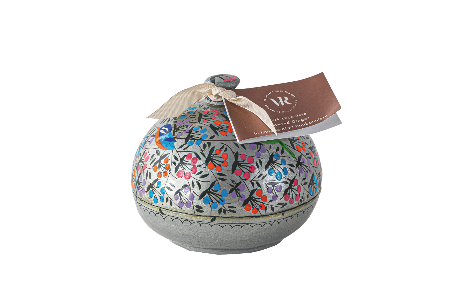 This traditional decorative Bonbonnier from Van Roy is filled with luxurious dark chocolate-coated ginger pieces. When the delicious treats are gone, the beautiful keepsake box can be reused and admired for years to come - it's the gift that keeps on giving!