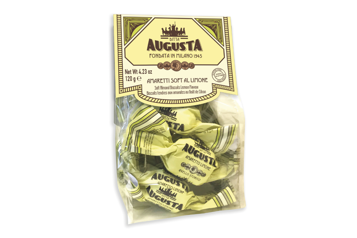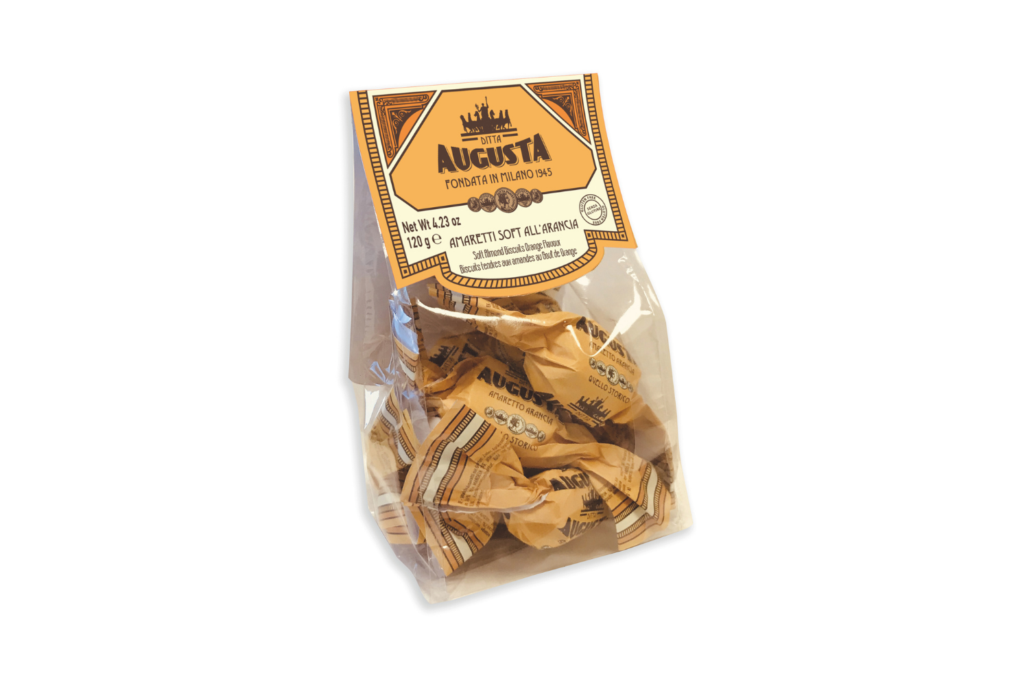 Augusta Panettoni was founded in 1945 in Milan by a master pastry chef using the traditional 'Panettone Milano' recipe. Augusta products are synonymous with quality, tradition, and passion. These soft Amaretti biscuits are produced using ingredients of the highest quality and wrapped in traditional tissue paper.