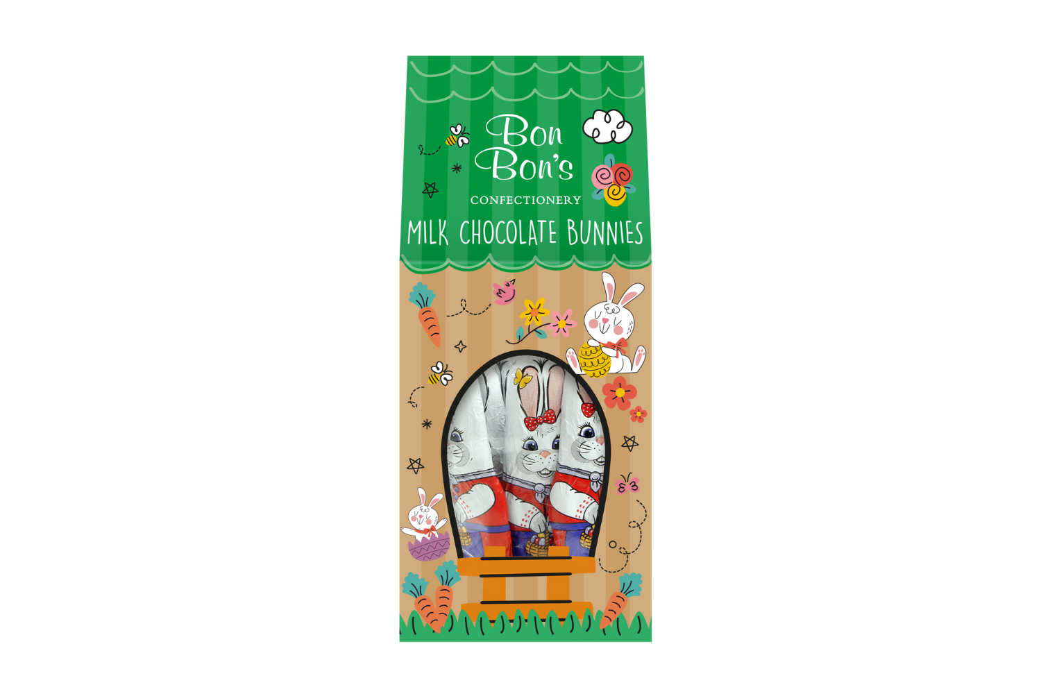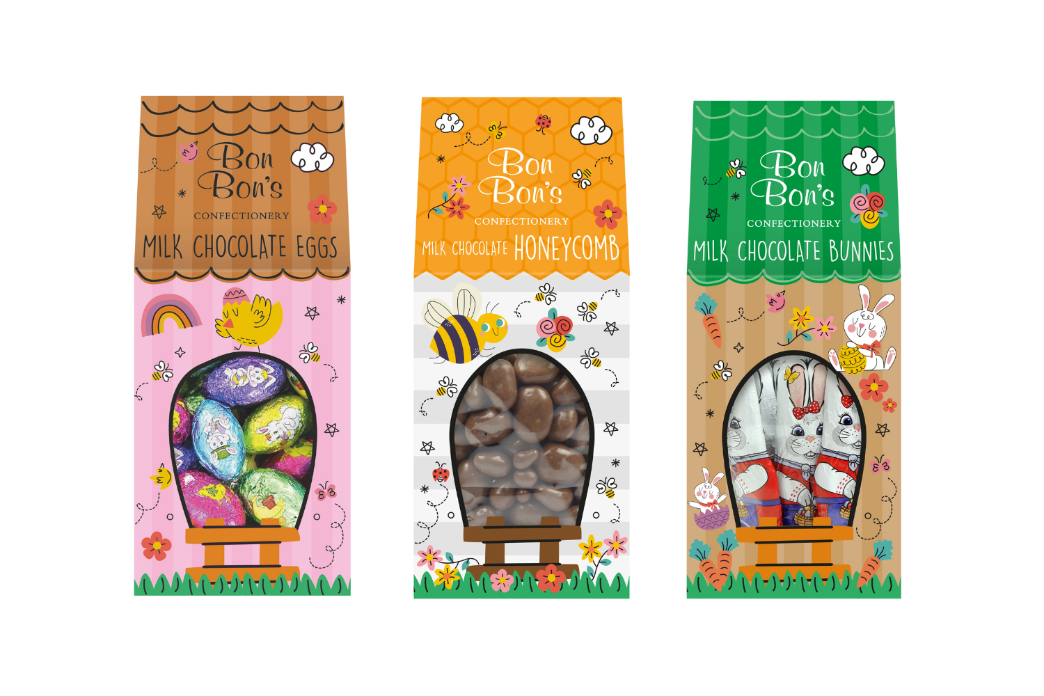 These gorgeous gift boxes are perfect for Easter. Choose from hollow milk chocolate eggs wrapped in colourful foil and packed in a decorative 'Hen House' box, wee solid chocolate Easter bunnies, or chocolate coated honeycomb in a 'Beehive'.