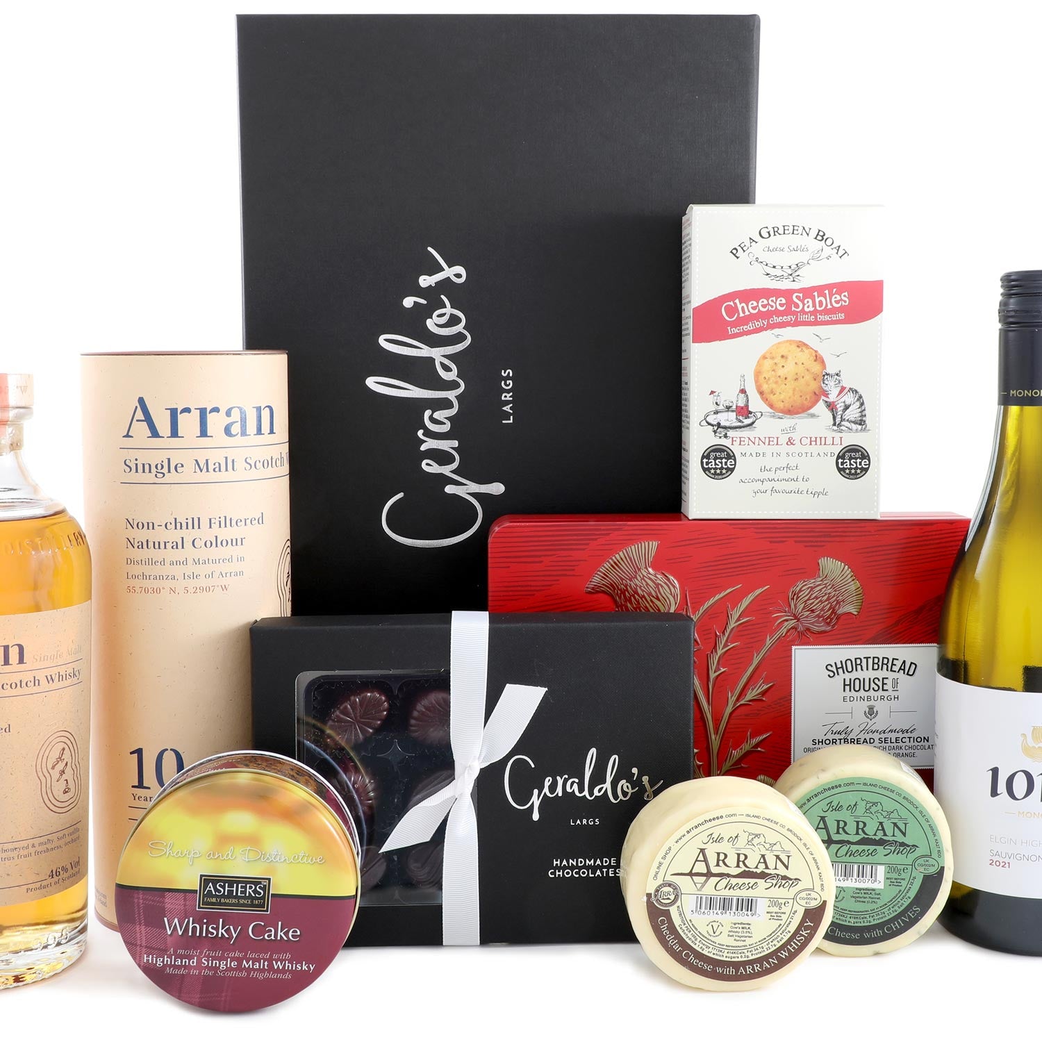 Lift the lid to discover a 70cl bottle of the classic Arran 10 Year Old Whisky, a South African Sauvignon Blanc, a Deluxe Gift Box of Scottish Parisian Creams, Scottish shortbread, whisky cake, Arran cheese and award-winning cheese sables.